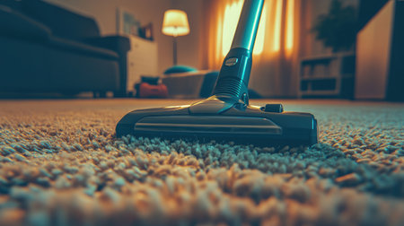 A vacuum cleaner head is positioned on a soft carpet, showcasing home cleaning in a cozy living room ambiance, enhanced by warm lighting and stylish decor.