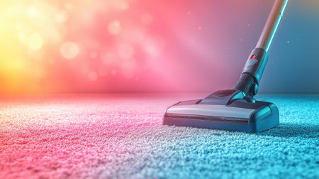 A close-up view of a vacuum cleaner head gliding over a soft carpet, showcasing vibrant colors. Ideal for illustrating home cleaning and maintenance tasks.