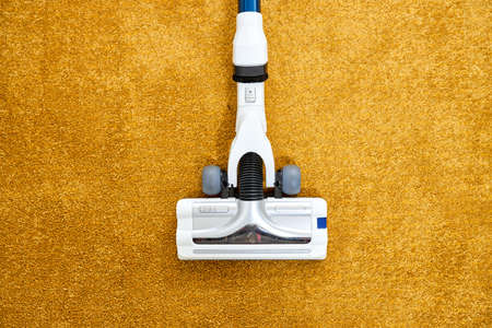 Close-up photo of vacuum cleaner applied on yellow carpet at home removing dust, cleaning at home, housekeeping