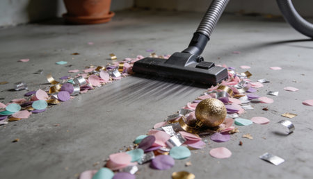 Decorative vacuum cleaner hose removing colorful confetti and glittery ornament from concrete floor after festive home celebration.