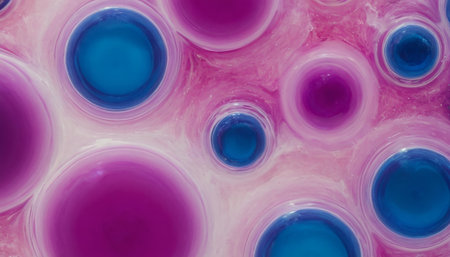A detailed macro shot presents a dense cluster of interconnected, translucent spheres, predominantly in shades of deep purple and bright blue, embedded within a soft pinkish, fluid-like matrix. The spheres a glossy, reflective surface, and their rounded forms create a visually engaging pattern. The evokes a sense of microscopic organic structures or a vibrant, abstract chemical reaction, with a clean and bright aesthetic.