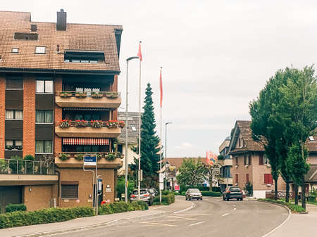 Apartment building and house on street of Wollerau, canton of Schwyz in Switzerland, Swiss architecture and real estate
