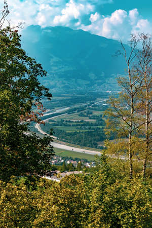 Skyline of Vaduz, principality of Liechtenstein. Scenic aerial view of city in Swiss Alps. Panorama of green valley with town and blue sky in summer. Landscape of Liechtenstein in Alpine mountains.