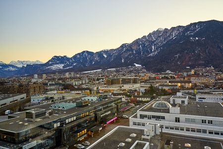 Downtown Vaduz Modern Buildings with Appenzell Alps - Vaduz, Liechtenstein