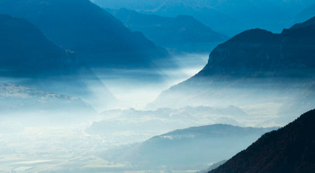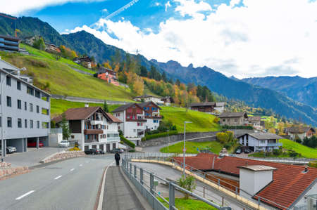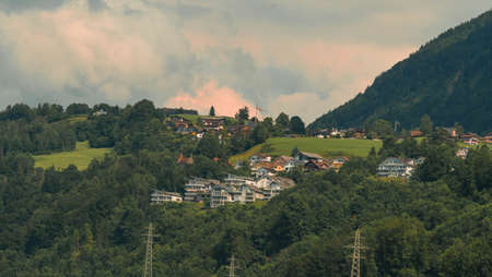 Triesenberg, Liechtenstein - October 2019: Landscape of hillside village in Triesenberg, a municipality in Liechtenstein, rests at an elevation of the Upper Rhine valley of the European Alps