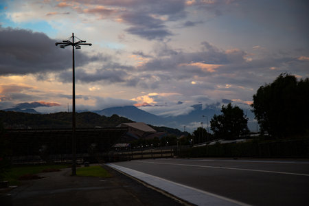 Light trails on the highway in the alps at sunset, europe travel and adventure through scenic mountain roads