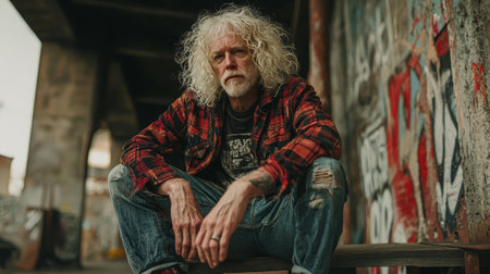 Vertical portrait of a rugged, bearded man with long blonde hair and orange-tinted sunglasses, sitting cross-legged on city steps in corduroy attire, looking directly at the camera while holding a smartphone, conveying a gritty urban lifestyle.