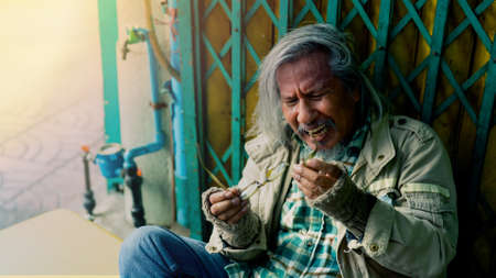 An elderly Asian man is homeless is very desperate as his last pair of glasses is broken and his leg is broken and his spectacles go down to the ground. no work, no home, and on roadside.