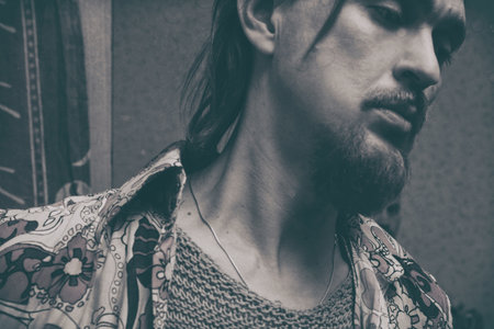 Portrait of a homeless with long beard and clothes in a state of stainedness.