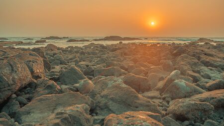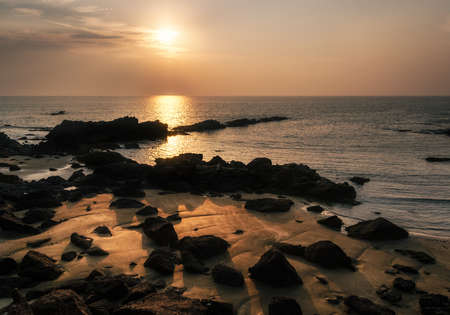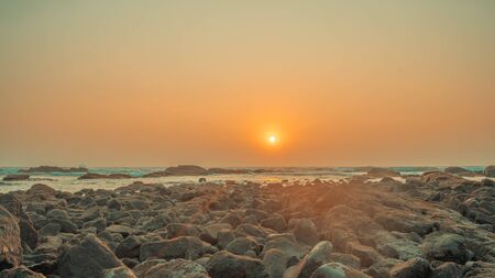 Sunset on the coast of the Sri Lanka at dawn with rocks in foreground. Beauty world