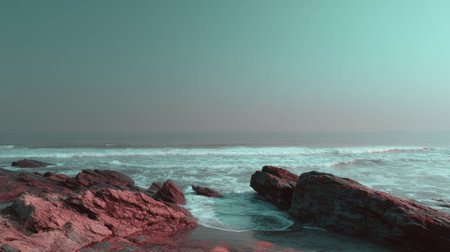 A tranquil scene captures the beauty of a coastal environment at dusk, featuring gentle waves lapping against rocks under a stylized haze, creating an artistic atmosphere.