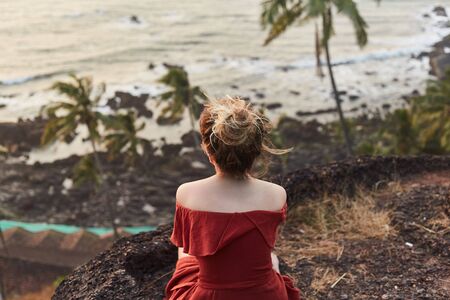 man at hilltop enjoying amazing landscape with sea horizon image is taken at gokarna karnataka india. the view from here is pristine and mesmerizing.