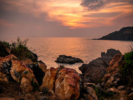 Tropical colourful sunset on the beach, Koh Chang island,Thailand. Panorama view of dark night sea with protruding stones
