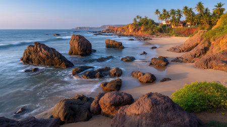 The image depicts a tranquil coastal scene with gentle waves lapping against a sandy shore. A rocky cliff is present to the left. Warm colors dominate the composition, suggesting a serene atmosphere. Ideal for a variety of commercial applications, the image is suitable for promotional materials or editorial content.