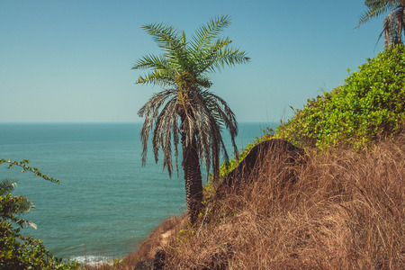 Nature background in vintage style. Beach of South Goa. Palm tree in the foreground against the blue sea.