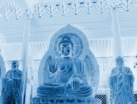 The asia golden buddha statue, The ancient art sculpture, The sign of Buddhism, Buddhist, godnes with cross process cool color developing background. The asian architecture.