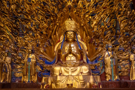 Dazu stone carving of the Thousand-Hand Guanyin located at the Baoding mountain Rock Carvings in Chongqing, China. It is a masterpiece of Chinese grotto art, known for its stunning details