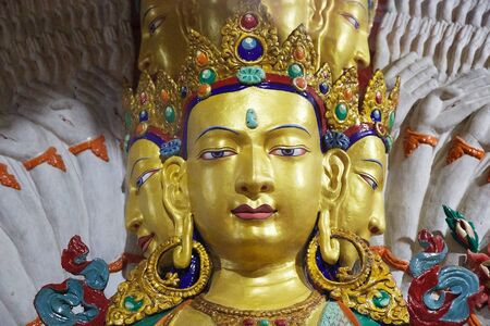 close up colorful sculpture of Maitreya buddha at Thiksey Monastery, Tibetan Buddhist monastery in Ladakh