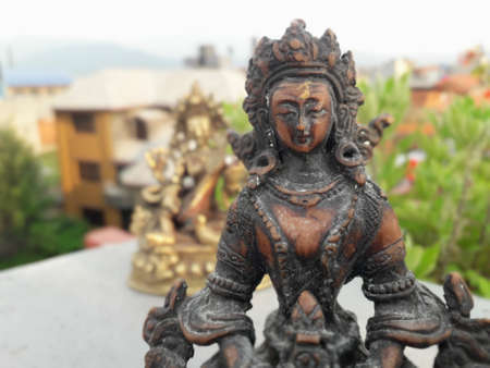 Green Tara - the embodiment of active love and sympathy of Buddha. The figurine made of bronze. Isolated on a gray background.