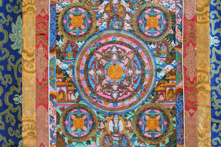 Intricate Tibetan thangka depicting a colorful mandala with Buddhist deities and symbols. Traditional Himalayan art used for meditation, spirituality, and ritual practices.