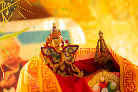 Goutama Buddha, Buddhist religious leader, being worshipped inside Okhrey Monastery - Sikkim , India. Image shot with permission.