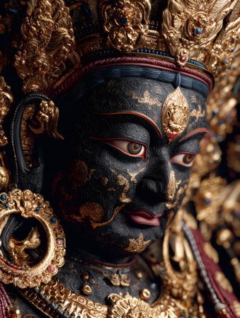 Mahakala, a Buddhist wrathful deity, sculpted with black textured skin and golden decorations