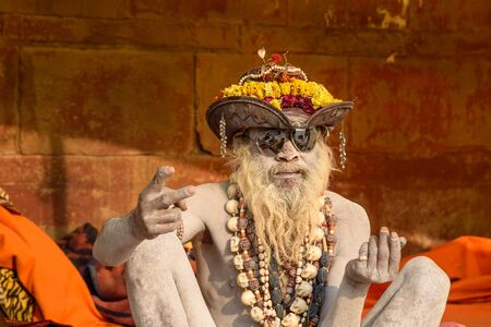 Varanasi, India - Dec 23, 2019: Sadhu at the ghats in Varanasi, Uttar Pradesh, ascetic holy mans in India