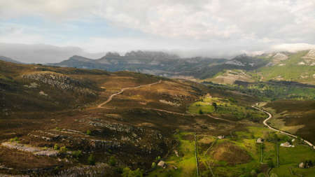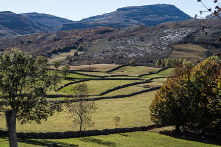 beautiful view of meadows and mountains at dawn north spain. High quality photo