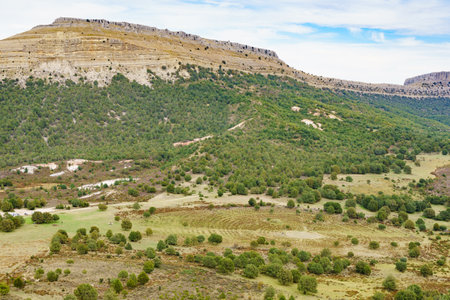 Crops fields and canyon of the river Riaza in Segovia, Spain. Natural vegetation of poplars next to the river and conifers on the limestone rock soil.