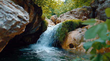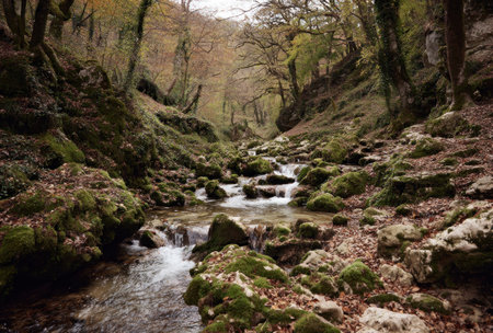 A gentle stream flows through a mossy, rocky canyon, framed by trees with autumn leaves