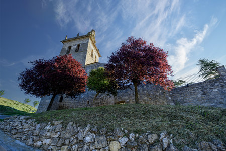 The Church of Santa Columba in Villamediana rises with a square stone bell tower, flanked by vividly colored trees and a robust stone wall, set against a brilliant sky with soft clouds and deep blue hues.