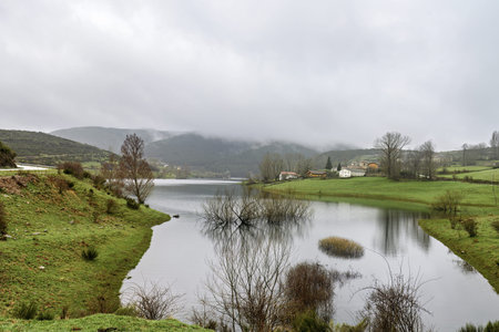 Town farm with snow in winter: Dawn of the Cardinals beside the reservoir of Camporredondo in Palencia Spain