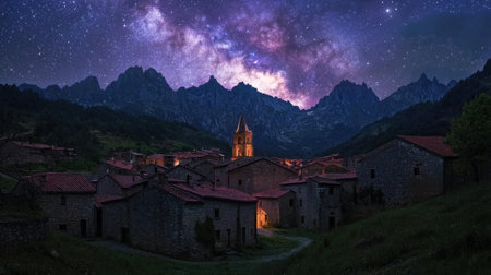 A serene mountain village is illuminated under a vibrant starry sky at night. The ancient stone buildings and a church tower reflect the calm of the landscape.