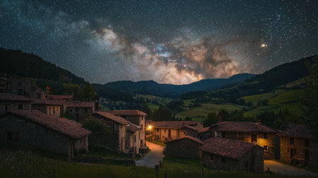 Nightfall unveils a tranquil mountain village, where cozy homes glow softly under a blanket of stars. The Milky Way stretches gracefully overhead, creating a breathtaking view.