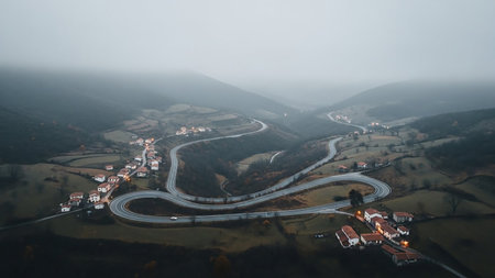 An aerial view of a winding mountain road passing through small villages nestled in a misty, foggy valley under a dramatic overcast sky.