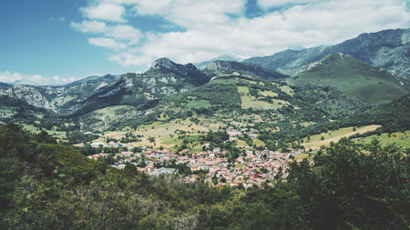 Picturesque view of Cabrales village nestled in lush green hills and dramatic limestone peaks of northern Spain, showcasing charming architecture and stunning mountainous landscape under a bright sky