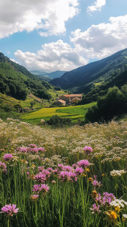 A picturesque landscape features a meadow bursting with colorful wildflowers, a charming farmhouse nestled among rolling hills, and distant mountains under a bright blue sky.