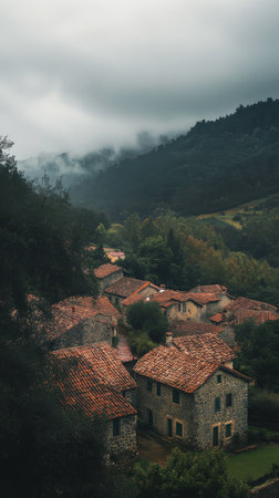 The medieval village of Taramundi reveals its character through stone houses surrounded by vibrant forests and rolling hills, all under a soft, cloudy light that enhances its timeless beauty.