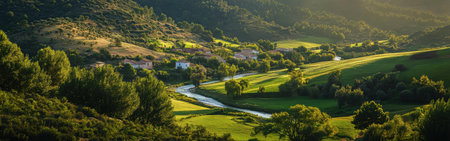 The Segura River gracefully flows through verdant valleys, with charming villages nestled on the hillsides, showing the peaceful beauty of rural Murcia during golden hour.