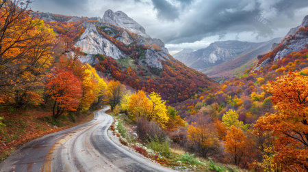 Winding road with colorful autumn trees in the mountains generative ai