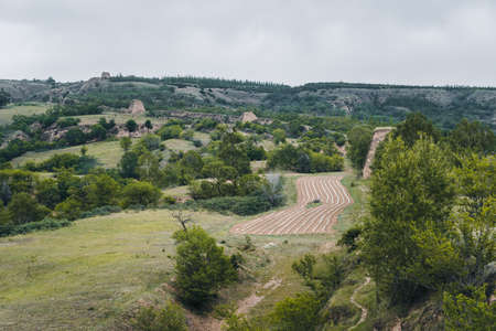 Tourist attraction in Spain. Green valley with Sad Hill Cemetery, the fictional round graveyard where the final duel of western The Good, The Bad and the Ugly takes place. View from above