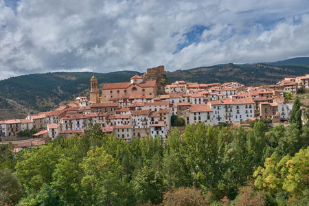 A stunning panoramic view of the charming little town of Linares de Mora unfolds, showing its whitewashed houses with red-tiled roofs, huddled on a hillside and dominated by a majestic church and the remains of a castle. Surrounded by mountains covered in dense vegetation, the town blends harmoniously into the natural landscape under a dynamic sky dotted with clouds. The image captures the scenic beauty and historical and cultural character of this Aragonese destination, ideal for illustrating topics such as rural tourism, heritage, traditional architecture, travel in Spain, village life, nature, and the tranquility of mountain landscapes.