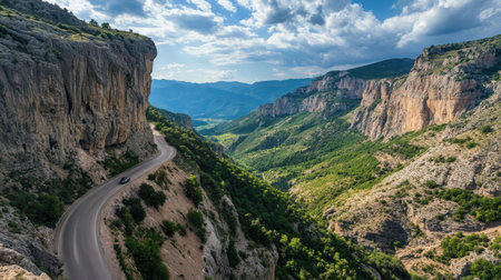A car winds along a narrow mountain road, surrounded by towering cliffs and lush greenery. The backdrop features rolling hills under a partly cloudy sky, creating an awe-inspiring view.