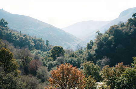Beautiful autumn landscape in the mountains. View of the mountain forest.