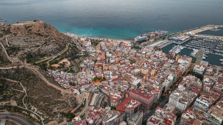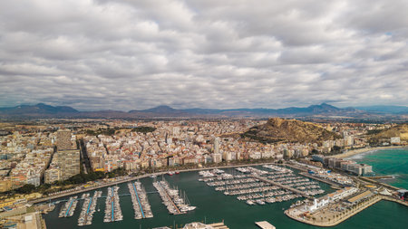 Aerial panoramic view of Alicante city with marina, Santa Barbara Castle, and Mediterranean coastline under cloudy sky