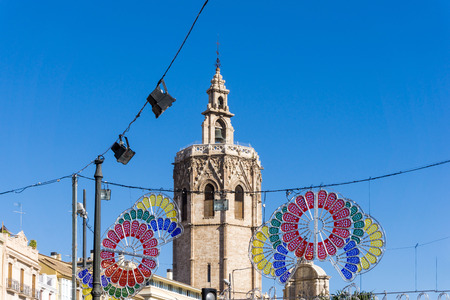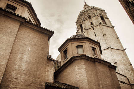 Valencia, Spain. Micalet tower, part of famous Cathedral. Cross processed color tone - retro image filtered style.