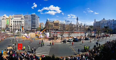 Valencia, Spain - March 7, 2019: Panoramic view of the town hall square in Valencia from one of its balconies, moments before the shot of a mascletá in Fallas.