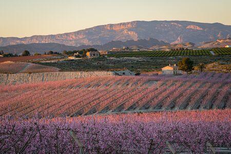 Flowering of the peach tree with the Sierra La Pila in the background in the Region of Murcia. Spain