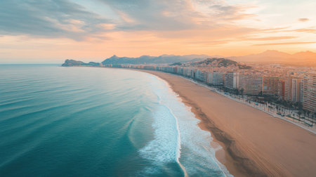 As the sun sets, calm waves gently lap the sandy shoreline of Altea, with beautiful reflections of orange and pink hues on the water, illuminating the coastal city.