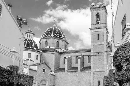 Beautiful Church of Our Lady of Consolation in the Mediterranean village of Altea, Alicante province, Spain; black and white image